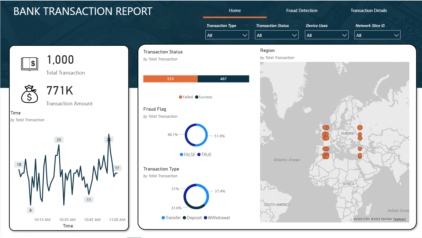This interactive dashboard was created in Power BI using raw transaction data. It provides key insights into bank transactions, fraud detection, and detailed transaction records. The dashboard helps stakeholders analyze: