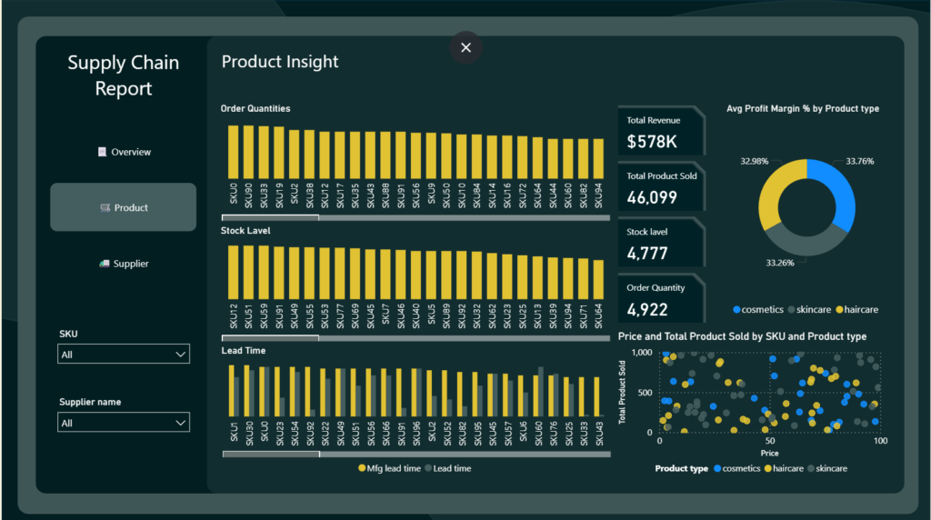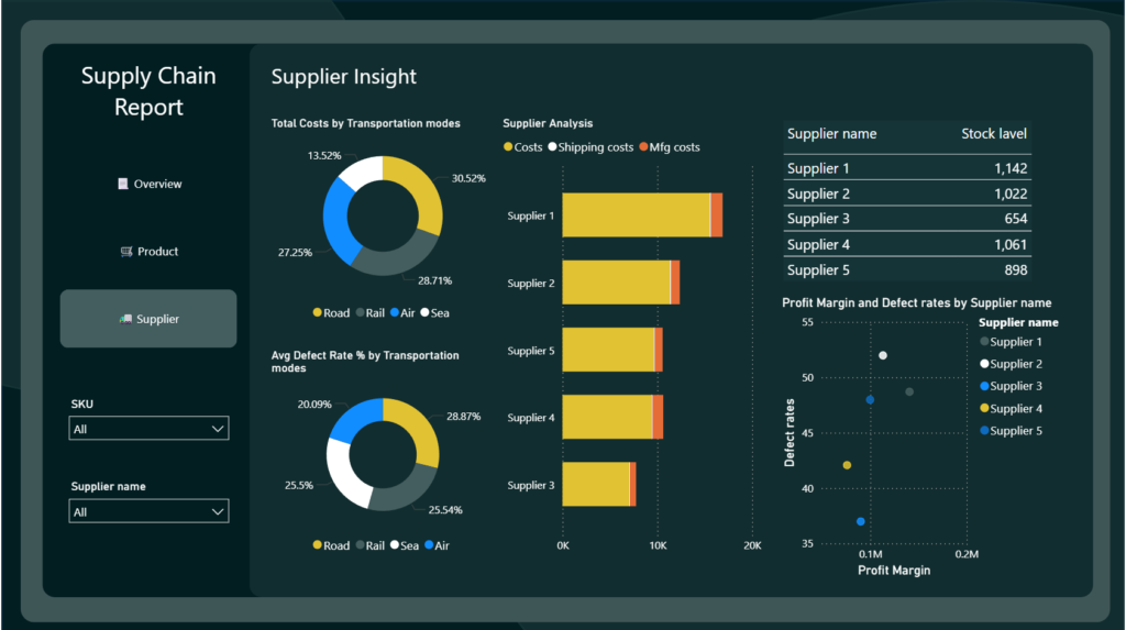 This dashboard was built in Power BI using raw supply chain data to analyze supplier performance, transportation costs, and stock management. It provides businesses with actionable insights for optimizing supplier costs, defect rates, and profit margins.
